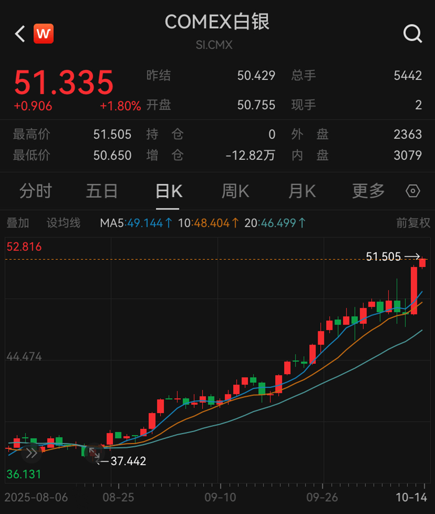 现货白银价格则涨幅超4% ,突破52美元/盎司关口,再创历史新高;今年以来 ,现货白银价格已飙升约80% 。截至13日收盘 ,纽约COMEX白银期货主力合约日内暴涨7% ,收报50.775美元/盎司 。