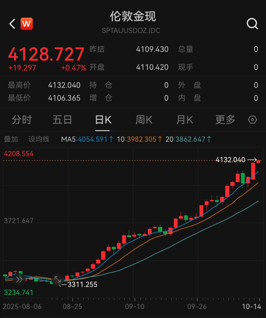 当地时间周一美国交易时段,国际金价和银价双双刷新历史高位 。截至13日收盘,现货黄金站上4100美元/盎司关口,日内涨超100美元 ,涨幅达2.29%;今年以来现货黄金价格累计涨幅超57% 。