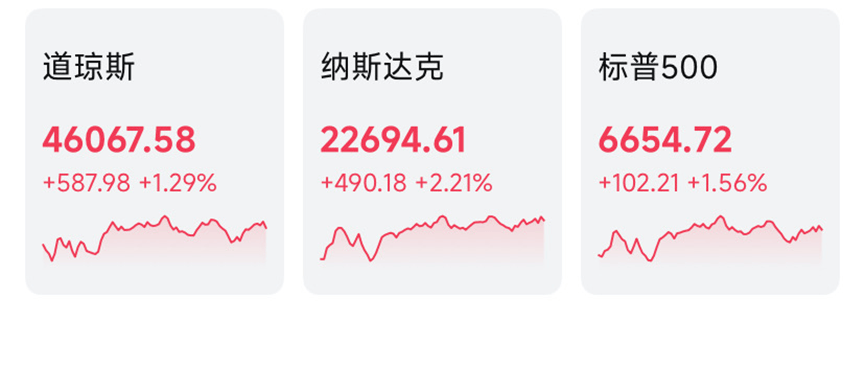 当地时间周一 ,美股三大股指全线收涨。截至收盘,道指涨1.29%报46067.58点 ,标普500指数涨1.56%报6654.72点 ,纳指涨2.21%报22694.61点 。